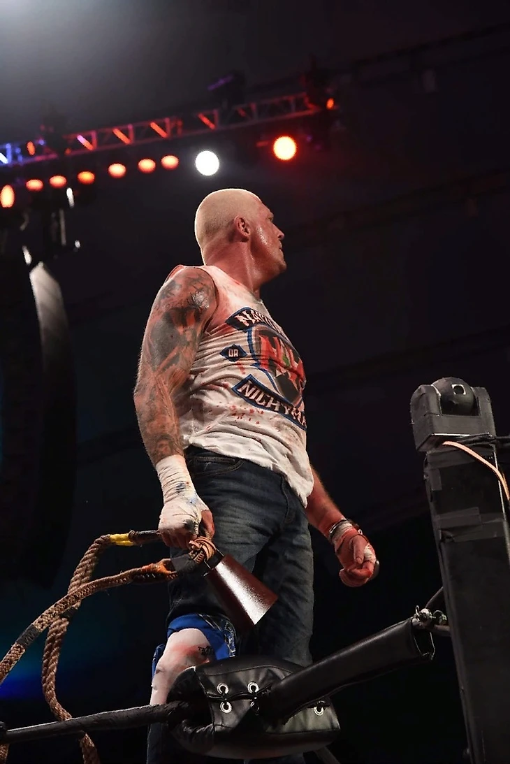В итоге он, по-видимому, сломал наручники и совершил камбэк, да еще и успел отходить обоих противников лестницей, пока ему не прилетело этой самой лестницей по глазам после удара стулом в лестницу от Мясника. Тем не менее, «Натурал» продолжил противостояние со здоровяком в рингсайде и выбил его из матча бульдогом в «деревянную» конструкцию. Между тем, КьюТи и Клинок продолжали разборки на ринге. Пеппер Паркс был сбит с ног сильным ударом крышкой мусорного бака, к которому прибавился элбоу дроп с вершины лестницы. Удержание – до 2.