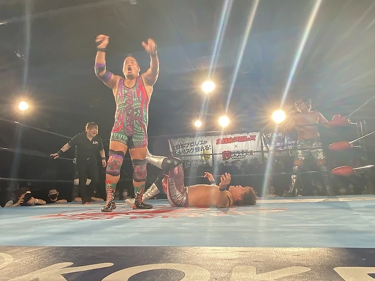 Здесь уже столкнулось более современное и можно сказать молодое поколение ростера - особенно с полутяжей в качестве командных игроков. И тем более - теми, кто является чемпионами компании: Ивамото мировой чемпион среди юниоров, а Изанаги - командный чемпион All Asia. И в данном матче команды оторвались друг на друге по полной программе, хотя им и выдали очень мало времени для более жёсткого поединка. Тем не менее - тут подобрались очень суровые по характеру оппоненты, которые не щадились друг друга и сражались до последнего за каждый удачный пинфолл. Сильнее всего по части жёсткой работы снова отличился Джейк Ли, который навёл такой же шумихи когда-то во время Карнавала Чемпионов.