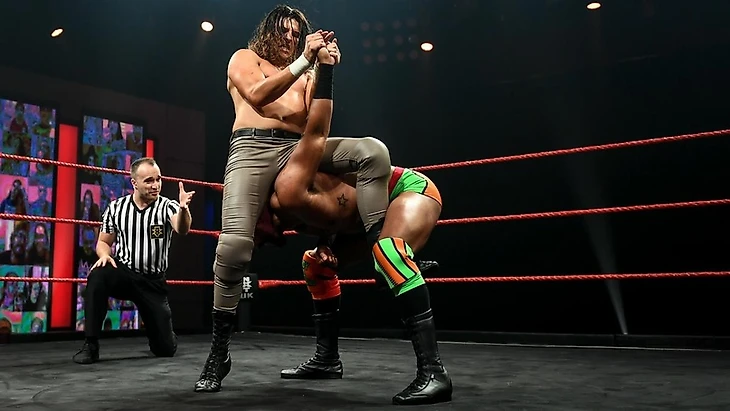 Открытие шоу предваряет тизер главного события вечера – решающей схватки между Кей Ли Рэй и Пайпер Нивен. Данный сюжет тянется так давно и подарил нам столько странных поворотов, что я не решусь вам его пересказывать. Вам следует знать только то, что вражда шотландок уходит корнями в 2019 год, на кону стоит Женское Чемпионство NXT UK, а их сегодняшний бой будет проходить по правилам Falls Count Anywhere. Но прежде нам предстоит вдоволь насладиться борьбой настоящих крутых парней.