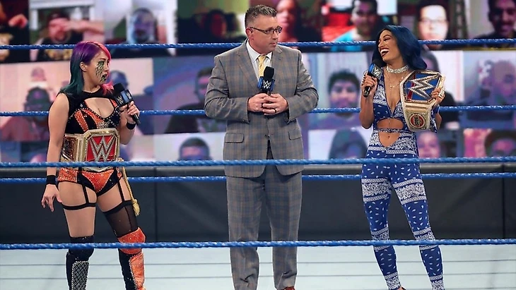 Состоялась ещё одна особая встреча между чемпионами обоих брендов - теперь уже дали слово прекрасной половине ростера WWE в лице женской чемпионки Monday Night RAW Аски и женской чемпионки Friday Night Smackdown Саши Бэнкс. Всё это дело проводил Майкл Коул и он разумеется представлял каждую из своих собеседниц с позиции их общих достижений как за этот год, так и в целом.