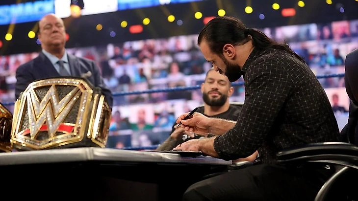 Для подписания контракта было всё готово - стол, два стула и Адам Пирс в качестве украшения и наблюдателя за порядком. Рейнс начал говорить о времени - о том, что Пол дал Роману ценный совет: мол Дрю правильный парень, в правильном месте, тут и сейчас даже. Только вот сейчас не его время - Дрю же понимает, что Рейнс умело хочет понять что в голове шотландца. Но Макинтайр указал что он выполнил своё обещание, да и выиграл титул не для Романа, а для себя. Так что Дрю не хочет терять времени - он ставит подпись и перед передачей контракта в руки Роману, советует Рейнсу использовать это время для трёпа по сторонам, а для подготовки в эти самые два мирных дня к большой войне.