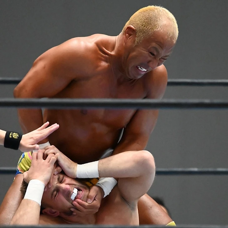 C cамого начала поединка, особо не торопясь, действующий чемпион IWGP в полутяжелом весе стал работать над ногой молодого льва. Тот пытался контрить, отбиваться, но в конечном счете это привело только к тому, что Таиджи перешел к работе над рукой и плечом Уемуры, понимая, что это может стать ключом к победе. Атлеты побывали за пределами ринга, где Йуя повстречался с баррикадой и стойкой ринга, а по возвращении в четырехугольник получил еще ударов по руке и что-то напоминающее Codebreaker. Спустя чуть больше, чем 5 минут страданий, Йуя наконец смог поймать соперника дропкиком, потом провести несколько неприятных ударов локтями и еще один дропкик. Бостонский краб последовал, но лишь на одну ногу, пототому что вторую Йуя не мог захватить поврежденной рукой, и Ишимори дотянулся до канатов, а потом реверсировал попытку коронного оверхэд белли-ту-белли в винтажный шоулдер брейкер, и Уемуре пришлось спасаться от YES! Lock у канатов. Попытку Bloody Cross молодой лев перевел в армбар, и теперь уже Таиджи пришлось тянуться ногой к кантам… за что он получил еще и немецкий суплекс, за которым вновь последовал армбар, но «Костяной Солдат» все это пережил, еще раз пресек Kanuki Suplex и заключил Йую в Bone Lock, который и принес ему очередные 2 очка.
