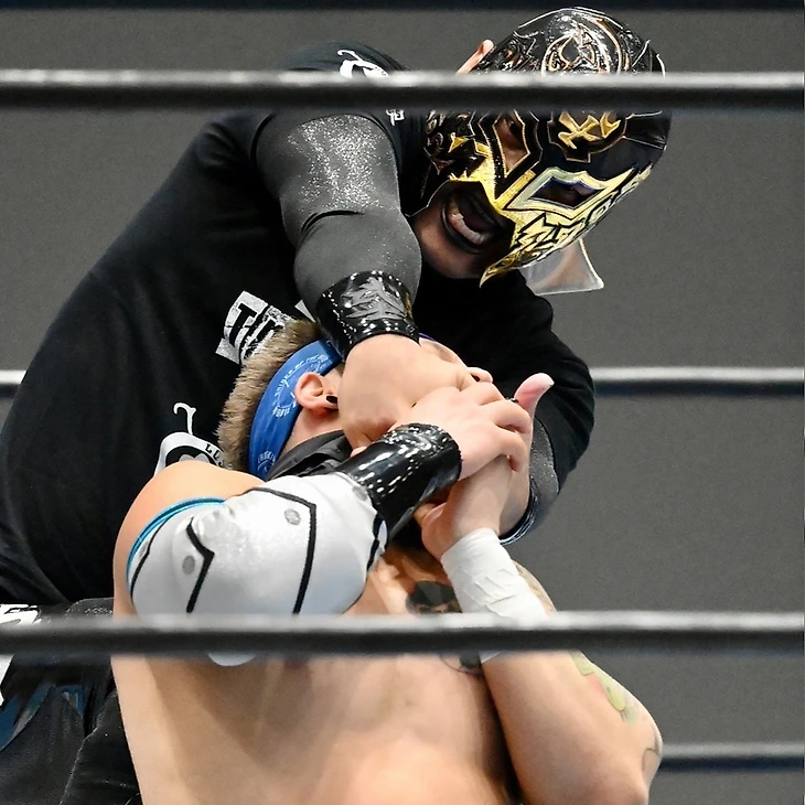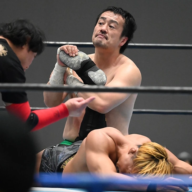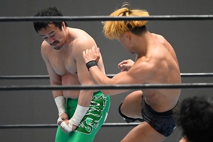 Тагучи немного потанцевал перед матчем, а потом парни обменялись рукопожатием, и бой начался. На старте мы увидели борьбу за инициативу на настиле. Затем начались разбежки, и ШО провел шоулдер тэкл… а потом Тагучи стал гонять соперника по рингу да так, что у самого голова закружилась. представитель Roppongi 3K еще немного покрутил визави, а потом попытался его удержать, но до 2. Тагучи вернулся в бой хип атакой, а затем решил помучить оппонента в болевом на ногу с использованием стойки ринга, на что ШО ответил бейсбол слайд дропкиком, добавив к нему апрон РК. Поломав руку Рюске о рингпост, провел еще пару атак на рингсайде и продолжил развивать инициативу в ринге, в какой-то момент даже сконцентрировавшись на атаках по главному оружию визави — по заднице. Претерпев 2 атомик дропа, Тагучи провел роллинг хип атаку, тут же добавив хай кросс за пределы ринга. По возвращении в четырехугольник ШО получил еще и спрингборд планчу, и от Three Amigos он отбился, но только для того, чтобы попасть в захват лодыжки. Канаты спасли ШО, и он умудрился перевести Buma Ye в сворачивание, попытавшись провести немецкий суплекс… и закончилось все это тем, что Тагучи получил гарпун. Еще чуть-чуть атак на руку Рюске, и рестлеры стали обмениваться ударами, и Тагучи попал в 2 немецких суплекса и армбар, который он перевел в захват лодыжки, ШО ответил реверсом, и все это закончилось сворачиванием от Рюске до 2, после чего он вернулся к захвату лодыжки, добавив еще и элбоу дроп на колено, нанося дополнительный урон. ШО вновь вернулся в бой, попытался провести Shock Arrow, но Тагучи ответил бэк бади дропом, противник попытался перевести это все в сворачивание, потянул за трико Рюске… и в этот раз под ними оказались красные трусы (сочетание зеленых трико и красных труселей тут же вызвали у японских комментаторов ассоциации с рождественской атрибутикой). В общем, из сворачивания ничего не вышло, и Тагучи провел еще одну хип атаку, на которую тут же получил лэриэт. Cross-armed Piledriver до 2, и Shock Arrow принес-таки ШО еще 2 очка.
