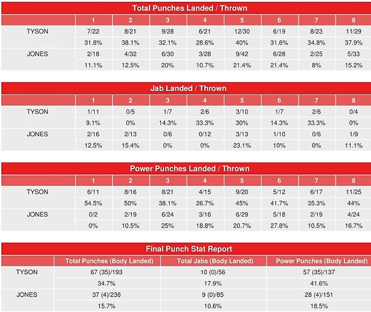 И судьи, наверное, для показательного боя дают ожидаемую ничью, хотя по справедливости Майк заслужил услышать вердикт в свою пользу. Кристи Мартин выставила 79-73 в пользу Тайсона (что, наверное, ближе всего к истине), Винни Пазиенца 80-76 в пользу Джонса, и Чед Доусон 76-76. А по статистике ударов Майк перебил своего оппонента, практически в каждом из раундов. Наверное, больше всего, как раз Тайсон и удивил, мало кто думал, что он будет выглядеть посвежее Роя в заключительных раундах. Ну, а самое главное, что никто никаких повреждений не получил.