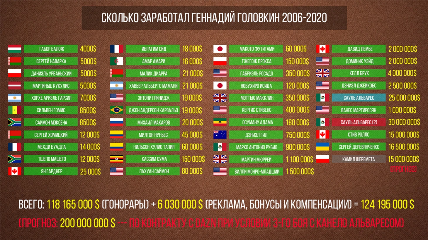Лишь после 30 лет он сможет начать выступать в США, где станет звездой мирового масштаба. Совсем недавно он подписал контракт с DAZN на 100 млн$ за 6 боёв. Ниже приведены гонорары легендарного боксера из СНГ: