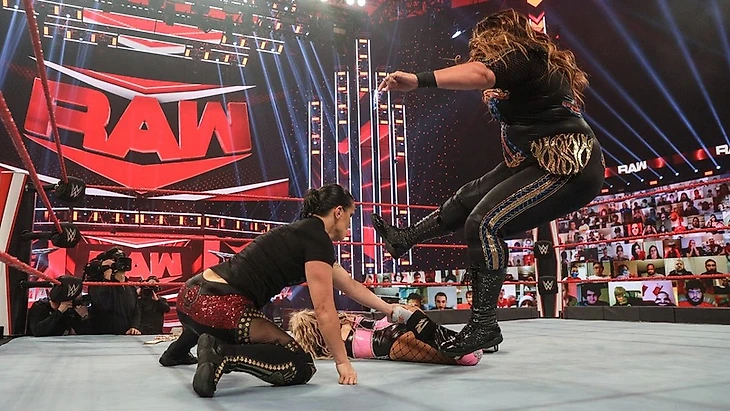 Естественно, самоанка принялась уничтожать соперницу, и нам показывали, как Аска болеет за подругу за кулисами. Реверсировала попытку пресс слэма харриканраной, провела кик в углу, но восхождение на третий канат Найя пресекла хэдбаттом, попыталась провести самоан дроп с угла. Лана ушла от этого, тщетно попробовала провести пауэрбомбу, а потом провела лоу кик, стомп и свернула командную чемпионку до 3. Естестенно, она была невероятно рада, а Шэйна тем временем атаковала Аску за кулисами, пока Джэкс напала на соперницу в ринге, проведя коронный лег дроп. Бэзлер поломала руку блондинки, как она это любит, стала ломать ногу, Лана в истерике просила не мучить ее, но получила 2 лег дропа на эту же ногу. Внезапно Аска прибежала, вытащила из ринга Шэйну, провела Найе codebreaker и суперкик, а Бэзлер досталась еще и хип атака. Плохие девушки ушли, а японка стала утешать командную партнершу.