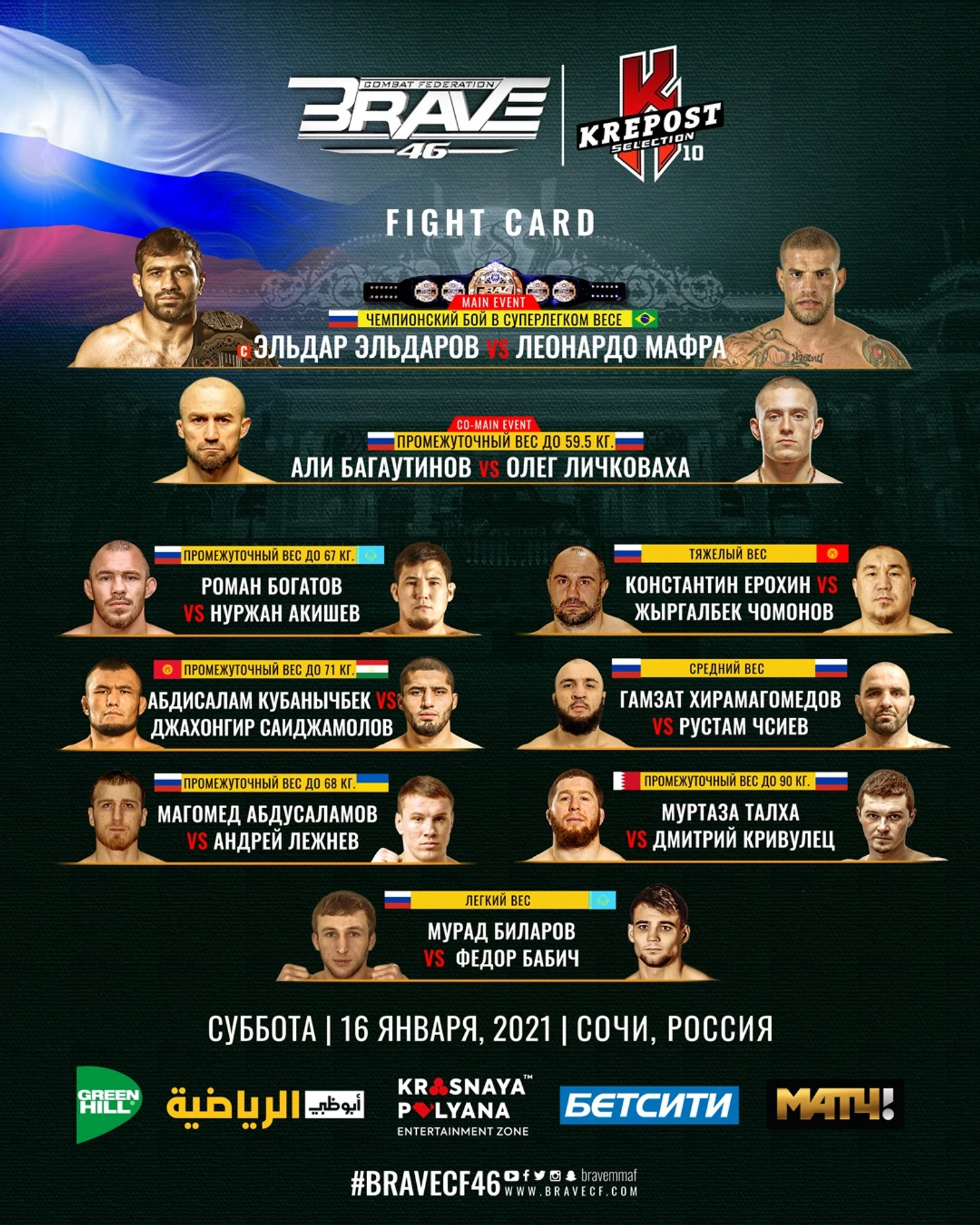 Возглавлять шоу будет возвращение на родину чемпиона мира в суперлегком весе Эльдара Эльдарова. Он впервые будет защищать свой пояс BRAVE CF против лучшего бразильского ветерана Леонардо Мафра. Впервые исторический пояс - первый титул чемпиона мира в новой весовой категории (до 75 кг) - будет защищать чемпион. В со-главном событии вечера Али Багаутинов дебютирует в промоушене против Олега Личковахи. Али - двукратный чемпион мира по боевому самбо и имеет ряд других наград в различных единоборствах, что делает его одним из самых успешных мастеров боевых искусств России. Он сразится с 24-летним Личковахой, который, несмотря на свой возраст, имеет около 20 профессиональных боев на своем счету и будет рассчитывать на самую крупную победу в своей карьере на BRAVE CF 46.