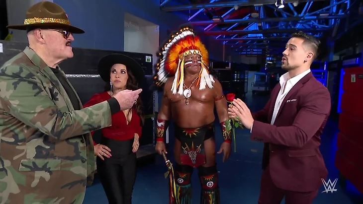 — Апогеем прогулок Анхеля Гарзы стала попытка подката к Торри Уилсон (она общалась с Никки Кросс, которая осталась для присутствия). Гарза предложил свою розу Торри, но она не захотела прервать своё общение с Никки. Отчего она и предложила Анхелю разделить эту розу с Карди Би, Кайли Дженнер и Арианой Гранде, которые прибыли на арену. Гарза повёлся на эту уловку и сосредоточившись на Карди Би... встретил вместо неё Бугимена. Предела шока для Гарзы тут не было и благодаря этому... его атаковал и свернул Ар-Труф, вернув себе титул 24/7. Плюс Труф получил порцию внимания от мисс Уилсон и мисс Кросс, покинув место этой встречи все вместе, а добил Гарзу Рон Симмонс со своим DAMN (Всё-таки Мелине повезло не попасть под каток пикапа от Гарзы, для последнего его неудачные попытки должны послужить уроком. Хотя это навряд ли случится, так как Анхеля тут подают как отбитого ловеласа, который не учится на ошибках. Примечательно кстати то, что Карди Би позднее в своём Твиттере не очень однозначно оценила упоминания себя от WWE, хотя позднее оценила стильный лук от Саши Бэнкс - женская чемпионка SDLive появилась за кулисами выпуска в компании Натальи и Микки Джеймс).