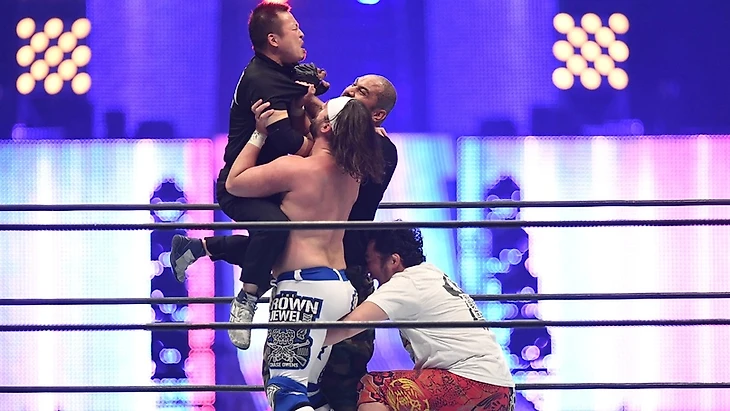 Ибуши справился с этим, но вновь Gedo comes into play, чтобы Джей провел неприятнейший чоп блок, к чему добавились dragon screw, проявление неуважения… и Кота просто перестал чувствовать урон, осыпав недруга серией страйков. Несколько жесточайших ударов, и мы достигли отметки в 30 минут, и японец настолько уничтожил своего противника в этом эпизоде, что Уайт уже был готов сдаться и предложил Ибуши просто удержать себя… за это чемпион обрушил на него еще кучу ударов, причем настолько разозлился, что судье пришлось оттаскивать «Звезду», который и оттолкнул его, так что Ред Шуз подвырубился немного, воспользовавшись чем «King Switch» провел удар ниже пояса. Вытащив Коту за пределы ринга, он несколько раз впечатал чемпиона в баррикаду и апрон, потом избил на рампе, и вернулся в ринг. Ибуши последовал за ним, получив в четырехугольнике флэтлайнер и парочку немецких суплексов. А нет, троечку «немцев» хотел провести Джей, причем последний на апрон, но Кота оказался не так прост, он отбился, а потом затащил Джея в супер немецкий суплекс с мертвой тяги. Жесткий Last Ride, и совсем чуть-чуть Уайт оторвал плечо от канвасе, чего хватило для кик-аута, и Kamigoye представитель Bullet Club перевел в слипер суплекс. Второй слипер суплекс. Regal Plex, но для триумфа и этого оказалось мало. Blade Buster Кота реверсировал, шарахнув Kamigoye… но только до 2. Тем временем, прошло уже 40 минут. Phoenix Plex наконец-то достиг своей цели, но Гедо вытащил рефери из четырехугольника во время, казалось бы, финального отсчета. Естественно, сам менеджер заскочил в ринг с кастетом… только для того, чтобы пасть после Kamigoye. Пока Ибуши возвращал судью в ринг, Уайт успел собраться на на Blade Runner, но и это еще не конец. Второго Blade Runner Кота избежал каким-то чудом, но угодил в OTT, который в этот раз был переименован в ITO (Ibushi Tap Out). Колоссальнейших трудов японцу стоило дотянуться до канатов, а потом он избежал Bloody Sunday… но попал под еще один Regal Plex при попытке провести V-Trigger. Bloody Sunday таки имел место быть, но, избежав Blade Runner, Кота провел V-Triger. Джей заблокировал Kamigoye… но Ибуши было уже не остановить, и он провел пару ударов коленом и лэриэт. Kamigoye в затылок, еще один в лицо, и титульная защита состоялась, а мы стали свидетелями самого длинного мэйн-ивента Wrestle Kingdom. После финального гонга Джей был настолько потерянным во времени и пространстве, что чуть не забрал себе титул, ибо видимо в той вселенной, куда его отправили 2 подряд Kamigoye, он таки стал чемпионом мира… Потом он хотел продолжить драку с чемпином, хотя двигался с трудом. В общем, Коте вернули «блестяшки», он стал праздновать, а на арене появился САНАДА в очень модном костюме. Он достаточно кратко спросил, может ли он попросить у Ибуши такой дар, как тайтл-шот. Ибуши вспомнил о их встрече в финале G1 Climax 30, заметив, что с тех пор «Golden Star» стал только сильней. Но от этого он только еще сильней хочет еще одного боя с САНАДОЙ. Рестлеры скрепили это дело рукопожатием, представитель LIJ спокойно покинул ринг, а комментаторы тем временем отметили, что не известно, когда этот матч состоится, но в будущем мы увидим бой между этими борцами. Кота напомнил нам, что он не убежит, не предаст нас, не проиграет… и он стал Божеством. Немного фейерверков в честь чемпиона, и шоу потихоньку вышло из эфира…