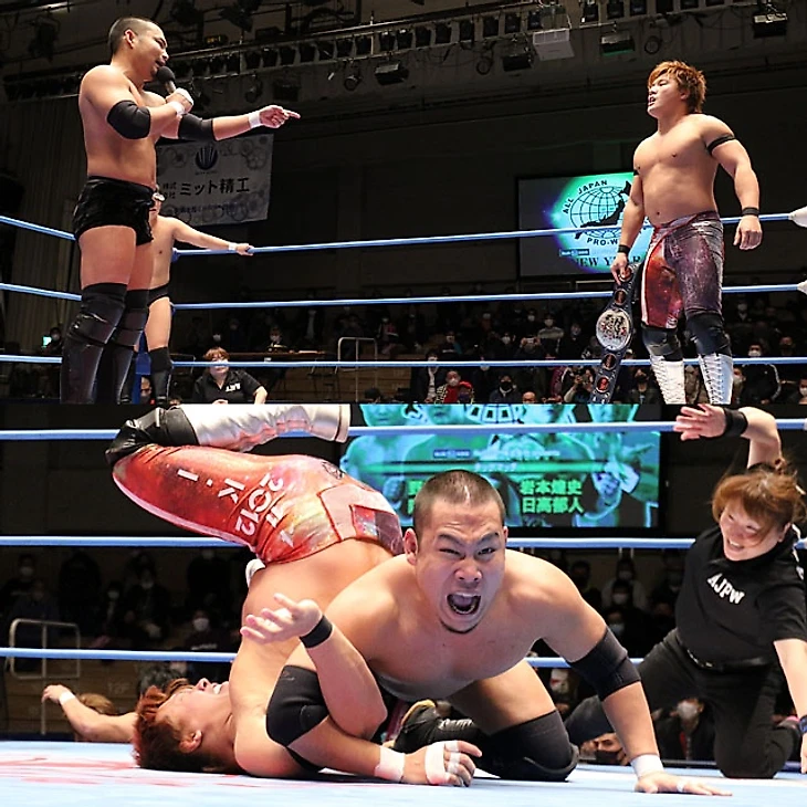 — Также состоялся командный поединок между полутяжами: против Коджи Ивамото (чемпиона AJPW среди юниоров) и Икуто Хидаки сразились с гостями из BJW, командой Astronauts (командными чемпионами BJW). Гости из BJW одержали для себя победу и к Ивамото обратился Фуминори Абэ, который захотел испытать Коджи в титульном матче. И именно за титул Ивамото - Коджи не стал пасовать перед новым вызовом и спокойно его принял.