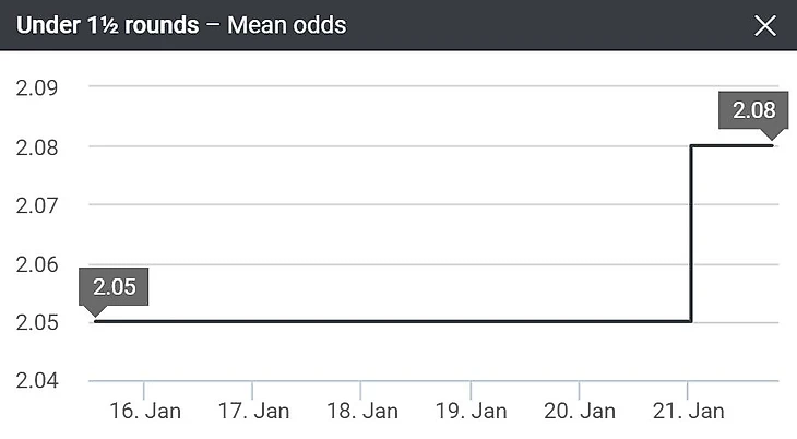При этом на то, что третий раунд не начнётся, дают всего лишь 1,63 и в качестве самого разумного прематч варианта можно выбрать ТМ 1,5 (7,5 минут) за чуть выше 2,0. Если вы любите играть на низких коэффициентах, то вас могут заинтересовать эти ставки, но я постараюсь найти что-то более выгодное.