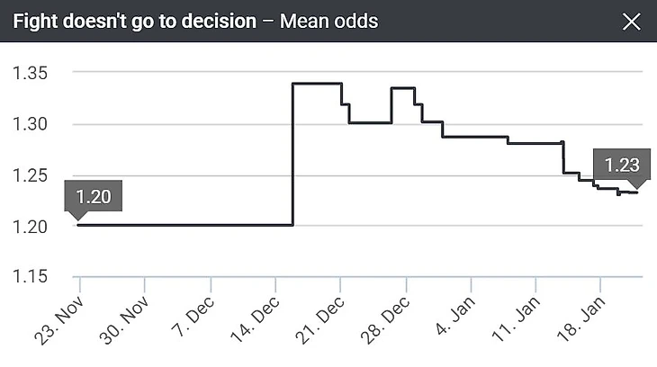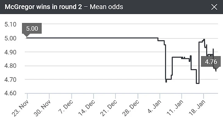 А вот в случае с Конором такие цифры не найти и я, пожалуй, остановлю свой выбор на его победе во втором раунде. Порье при грамотном геймплане вполне способен пережить первый раунд, а во втором уже должен будет сказаться накопленный урон. Сейчас на эту ставку дают в среднем почти 5,0 и если ближе к бою на просто окончание схватки во втором раунде будут давать немногим меньше, то меня и это устроит.