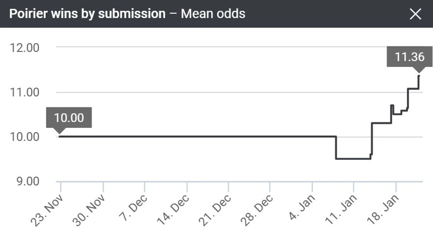 3. Методы победы и дополнительная роспись. Я не отрицаю возможность Порье на победу, просто ставить какую-то разумную сумму на коэффициент 3,46 мне не хочется. Эти цифры, как я считаю, не соответствуют шансам, но один из исходов я всё же присмотрел. Инсадеры из-за океана доносят, что Дастин усиленно налегает на борьбу и не собирается рисковать с Конором в стойке, а это значит, что если ему удастся реализовать этот план, то будут все шансы закончить бой болевым или удушающим приёмом, а на такой исход в среднем дают чуть выше 11. Вот этот вариант интересен и стоит того, чтобы поставить на него относительно небольшую сумму.