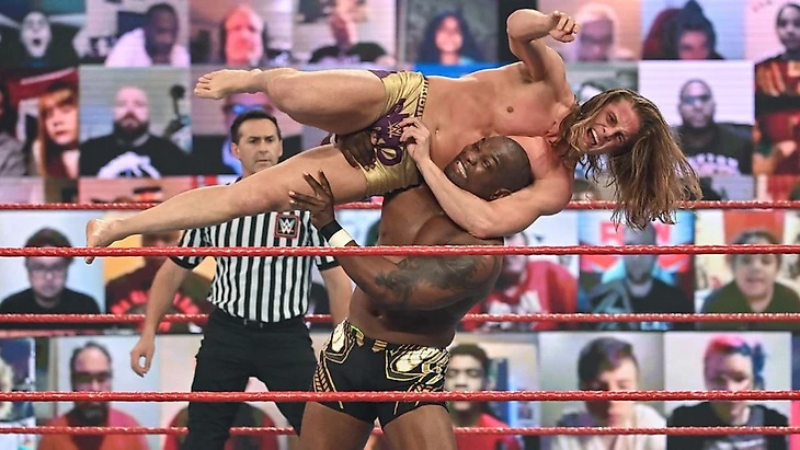 Начал матч Мэтт против Шелтона, отвесив несколько коронных ударов, а потом приземлившись на ноги при попытке оппонента провести немецкий суплекс. Серия реверсов, и Бенджамин перевел попытку колена в спайнбастер до 2. Жесткое колено в углу ринга, скуп слэм, но Риддл никак не хотел сдаваться. Пострадав немного от качественной работы командного чемпиона, Риддл поймал его в гильотину, отбился от попытки реверса в суплекс и был отвлечен Александром. Сворачивание Шелтона Мэтт попытался реверсировать в собственный ролл-ап, но все-таки сам попал в сворачивание, которое рефери не отсчитал, потому что отвлекся на Седрика. Естественно, Бенджамин стал предъявлять претензии своему партнеру, позволив Риддлу свернуть себя до 3. Конечно, даже после этого конфликт между командными чемпионами продолжился, ЭмВиПи попытался успокоить своих подопечных, судья дал отмашку о старте матча, и Мэтт вышел на heel hook, от которого Монтел сдался. Шоу ушло на рекламу, а когда мы вернулись, Седрик выбивал весь оставшийся дух из бывшего командного чемпиона NXT. Пару коленей, гатбастер до 2, и Риддл начал потихоньку возвращаться в матч с помощью коронных киков и ударов предплечьем… пока не нарвался на дропкик из неоткуда. Удержание до 2, и доминирование полутяжеловеса продолжилось, и заход на Bro to Sleep он перевел в DDT до 2. Снова пережив серию атак, Риддл вернулся в бой с помощью коронных страйков, провел эксплоудер, но ни РК, ни мунсолт цели не достигли, а сентон Александр встретил коленями. Обмен ударами последовал, и Риддл провел внезапный немецкий суплекс, получив в ответ брэйнбастер до 2. ЭмВиПи все это время поучал Седрика, который провел серию стомпов, забрался на третий канат и не преуспел дайвом, угодив в треугольник. Александр попытался ответить пауэрбомбой, но Мэтт вновь применил болевой. Серия реверсов, очень плотное сворачивание от Риддла, и это победа. Отметить победу ему не позволил Бобби Лэшли, атаковав новоявленного претендента и применив свой Hurt Lock.