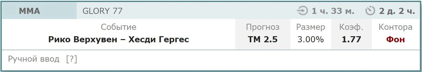 Rico Verhoeven vs. Hesdy Gerges | Heavyweight Tournament Semi-Finals A В первом полуфинале турнира-четвёрки Рико Верховен сразиться с ветераном организации Хесди Гергесом. Если кратко, то Гергес возрастной боец, который редко выступает, не так давно проиграл нокаутом за считаные секунды и этот бой он принял на коротком уведомлении. Никакой речи о подготовке, геймплане или хорошей физической форме там даже близко не идёт. Боец давно уже не демонстрирует что-то вменяемое и чемпион должен без особых проблем его проходить. Привлекает внимание в этом противостоянии лишь то, что в БК Фонбет на ТМ 2,5 (ставка на то, что бой закончится в течение двух раундов) дают 1,77. Это, пожалуй, самый выгодный вариант на этом турнире.