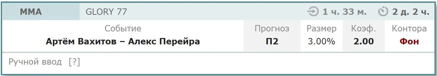 Artem Vakhitov vs. Alex Pereira | For the undisputed Glory Light Heavyweight Championship Если послушать интервью Артёма Вахитова, то простой позволил ему залечить травмы и пройти полноценную подготовку, но я считаю, что этот фактор всё равно сыграет ему в минус. Сомневаюсь, что он сможет показать в бою пик формы и Алекс Перейра, который идёт небольшим андердогом, выглядит гораздо предпочтительней, как объект для ставки. Бразилец даже в пандемийный год смог провести несколько боёв и на протяжении всей карьеры демонстрирует отличную форму, а в нашего соотечественника можно верить, но нельзя рассчитывать