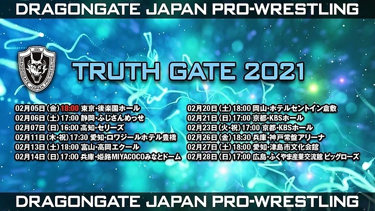 — Также Dragon Gate объявили не только о датах Champion Gate (6 и 7 марта), но и о новом турне под названием Truth Gate. Оно станет билд-апом к двухдневному мартовскому ивенту и продлиться 12 дней (с 5 по 28 февраля).