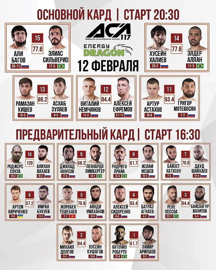 12 февраля в Сочи на арене WOW Arena, лига Absolute Championship Akhmat проведет турнир - ACA 117, в главном событии которого экс-чемпион промоушена в легком весе Али Багов сразится с представителем Бразилии Элиасом Сильверио. Со-главным событием турнира станет бой Хусейна Халиева с Элдером Аланом Аморимом.