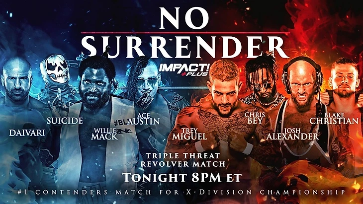 4) Джош Александер против Дайвари против Суисайда против Уилли Мака против Трея Мигеля против Эйса Остина против Криса Бэя против Блэйка Кристиана - поединок за претенденство №1 на чемпионство Х-Дивизиона Impact по правилам Revolver Three Way Match.