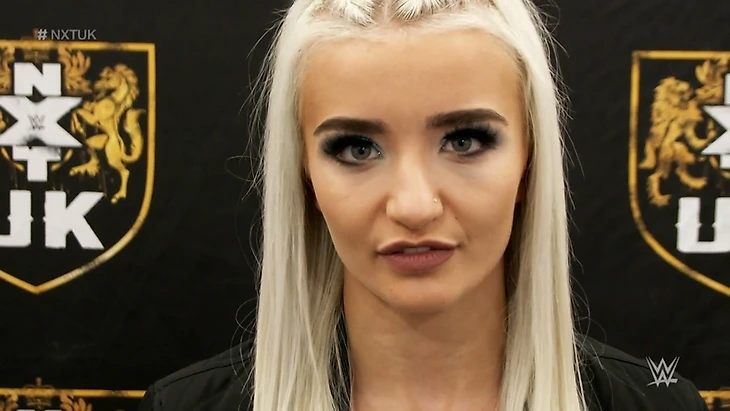 Английская журналистка задает Мейко вопрос по поводу того, как себя ощущает Сатомура в стенах NXT UK, на что претендентка отвечает, что у неё есть стойкое убеждение что она тут не с проста.