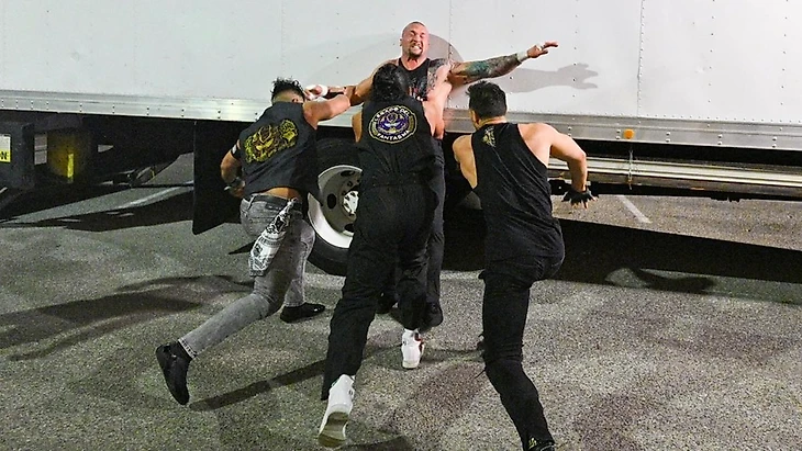 Кросс напал на «Легадо дель Фантазма» прямо на парковке и легко разобрался с Хоакином и Мендозой. Сантос попытался атаковать его со спины, но сам, в итоге, принялся получать от бывшего чемпиона NXT. В какой-то момент Кэррион закинул оппонента внутрь контейнера рядом стоящего грузовика, но Эскобар использовал дверь этого контейнера, чтобы прижать Кросса. После этого он принялся концентрировать атаки на травмированном плече оппонента, но тот быстро пришёл в себя. Сантос попытался спрятаться в кабине кузова, но Кэррион несколько раз ударил по ней своего рода киркой, чтобы выкурить оппонента. В этот момент вернулись остальные участники «Легадо», и совместными усилиями они перехватили инициативу, кинув лысого и пучащего глаза несколько раз о контейнер. После этого они завели Кросса на арену и принялись избивать его там. Но он начал отбиваться и, пока Сантос был уверен, что его ребята всё держат под контролем, и шёл к рингу, Кросс проломил баррикаду Уайдом и Мендозой. После этого оба ненадолго забрались на ринг, но уже после первого биг бута Эскобар выкатился за ринг и атаковал Кэрриона стальным стулом, а затем несколько раз запустил оппонента травмированным плечом в разные объекты. В течение следующих минут Сантос продолжал доминировать, обрабатывая плечо Кросса, а в опасные моменты вмешивались Хоакин и Рауль, чтобы помочь своему лидеру сохранить преимущество. В какой-то момент Кэррион начал-таки возвращать инициативу, проведя несколько эксплоудер суплексов Сантосу, а затем не дав ему запустить себя в рингпост, а ударив его самого о стальную конструкцию. Пока Эскобар лежал на ступенях, Кросс попытался ударить его стулом, но его спас Уайлд. Кэррион закинул оппонента на ринг, после чего разобрался окончательно с его прислугой. После нескольких атак в углу ринга чемпион полутяжей выкатился за пределы четырехугольника, но это не было спасением, ведь он получил сайто суплекс на комментаторский стол, а затем ещё один на ринге и удар локтём в затылок, после которого Эскобар уже не поднялся.