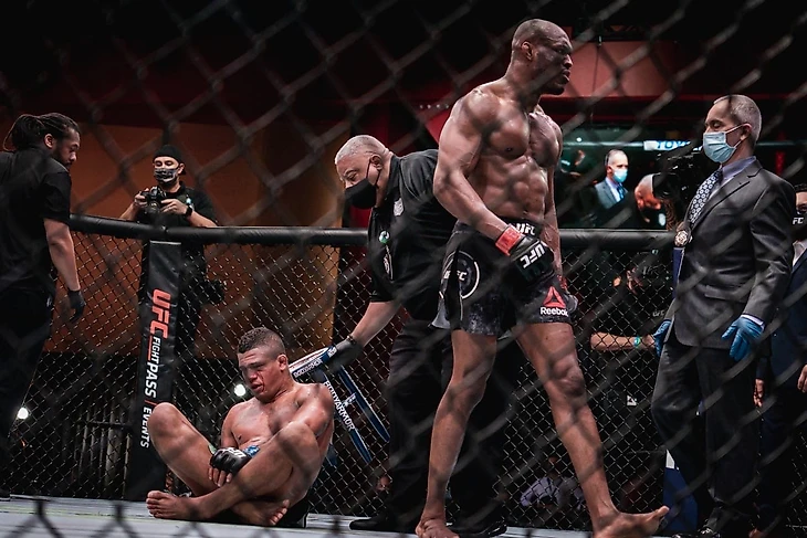 Мне очень понравилось выступление Александра Волкова, который без проблем разобрался с Оверимом. Так же вышеупомянутый Аспинелл провел отличный бой с Орловским, сегодня впечатляющий дебют в UFC совершил Ронни Лоуренс, но самое впечатляющее выступление я все же отдам другому бойцу. Камару Усман утвердился в статусе доминатора полусреднего дивизиона, одолев своего бывшего товарища по команде Гилберта Бернса. Чемпион начал бой не совсем удачно, пропустив тяжелый удар, но проявил стойкость и не дал развить успех своему сопернику, ну а со второго раунда его уже было не остановить. В итоге уверенная победа техническим нокаутом в третьем раунде.