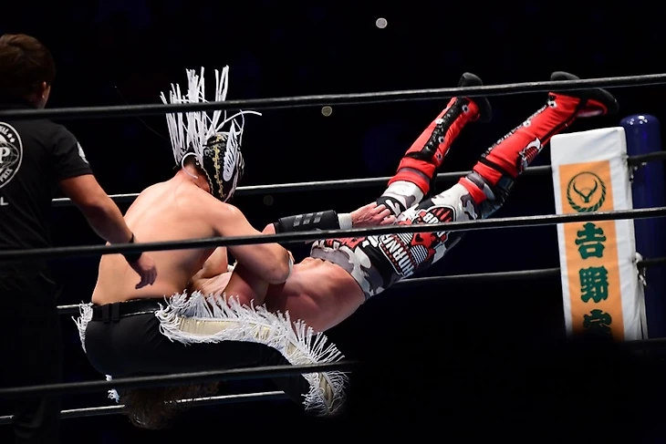 Как мы помним, Такахаши вынужден был вакантировать титул из-за травмы, и эта троица выявит, кто же станет новым лидером дивизиона в отсутствии главной звезды. Примечательно и то, что многосторонники в NJPW проходят крайне нечасто. Начался 23-минутный бой, естественно, с борьбы за инициативу, победителем из которой вышел, пожалуй, БУШИ, проведя в итоге связку из бульдога и дропкика обоим противникам, но только до 2. Фантазмо же смог собраться, усадив обоих визави на канаты, и шарахнув бэк сентон на Деспи. Работа над пальцами и кусания этих самых пальцев последовали, после чего представитель Bullet Club зашел на «олд-скульную» прогулку по канатам, которой он так увлекся, что в итоге сам уселся причинным местом на канат. Правда уже в следующий момент БУШИ шарахнул Эль Десперадо фирменный DDT на апрон. Спрингборд харриканрана досталась Эль Фантазмо, но лишь до 2. Уже в следующий момент представитель LIJ полетел коронным жестким суисайд дайвом на Деспи за пределы ринга, к чему добавился спрингборд бади пресс ELP на обоих соперников. Затем Фантазмо утащил члена Suzuki-Gun на рампу, где порвал его маску! Жесточайший Gotch-style Piledriver прошел, а потом он сорвал с Десперадо остатки маски и примерил на себя (what a dick!). Смотрелось это дело очень жестко, и особенно когда свет в той части арены, где лежал Деспи потушили, молодые львы рванули оказывать ему помощь и позвали предположительно медиков из-за кулис. Эль Фантазмо же тем временем топтал маску финалиста прошлогоднего BOSJ. Затем он отвесил пару атак БУШИ, но тот отбился миссл дропкиком, выкинув ELP за пределы четырехугольника слингшот харриканраной.