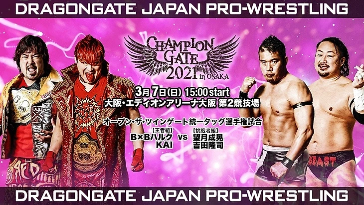 — Первым был поединок между Natural Vibes и Дрэгона Кида с ЯМАТО. Перед самим матчем чемпионы станцевали, полным своим составом, но без Камея и Ю-Ти, успев немного поговорить - причём даже было место разговорам об их оппонентах на сегодня. И похоже что это было не шибко в уважительном тоне, но и без грубостей, чисто чтобы простимулировать оппонентов. Сами Кид и ЯМАТО не спешили начинать матч, чтобы показать Хоригучи и Кэйзи какие их оппоненты ловкие-опасные. Правда если Кид показал это дело с первого раза и на одном дыхании, то вот ЯМАТО не сразу сумел это показать, задерживая начало боя и рассмешив зрителей. Его приготовленный кувырок на ноги вперёд всё-таки прошёл, но Генки сразу же пошёл в атаку и матч был начат. Поединок был быстрым и коротким по времени, а завершился он победой Дрэгон Кида и ЯМАТО, последний кстати и принёс победу, удержав Генки Хоригучи после Discuss Driver (По сегменту до матча можно понять, что ЯМАТО не только андердог по жизни и красавчик, но и очень смешной малый. А по результату матча, то возможно в будущем новая группировка Кида, ЯМАТО, Окуды и Бен-Кэя получит свою возможность повоевать с Natural Vibes. Если конечно те защитят свои титулы на Champion Gate от победителей мини-турнира);