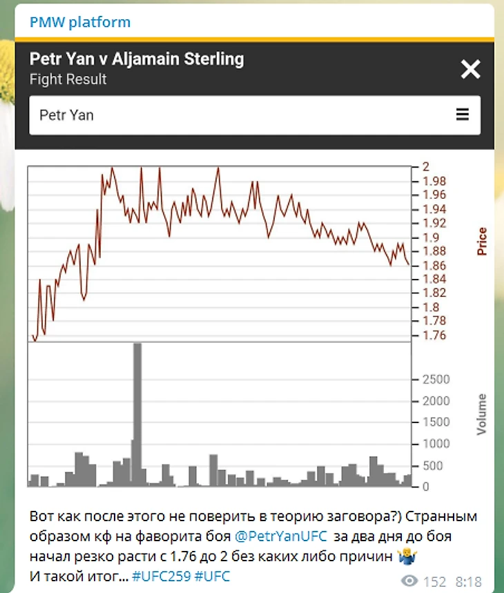 Неожиданное завершение боя между Петром Яном и Стерлингом, для некоторых не стало трагической случайностью , на сервисе мониторинга ставок PMW была выложена аналитика изменения коэфф. ,согласно данным сервиса за пару дней до боя коэфф на победу Яна (фаворита) без каких либо причин начал расти и в пиковом моменте Стерлинг на несколько часов стал фаворитом боя , что мало напоминало реальность и расклад сил. Чем был вызван данный скачок так и осталось неизвестным
