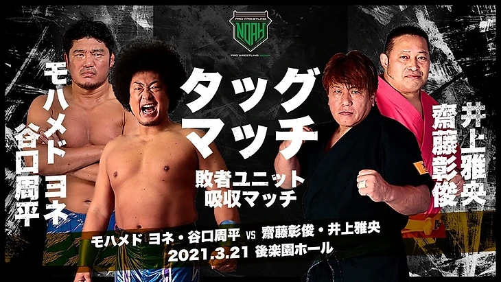 — Следом был чуть более непримечательный поединок из числа местных лоукардеров: Мохаммеда Йонэ и Шухея Танигучи против Акитоши Сато с Масао Иноуэ. Бой не продлился дольше 10 минут, завершившись уверенной победой команды ветеранов. Любопытно, что NOAH решили провернуть дело до организации реванша (он состоится 21 марта на шоу NOAH The Infinity);