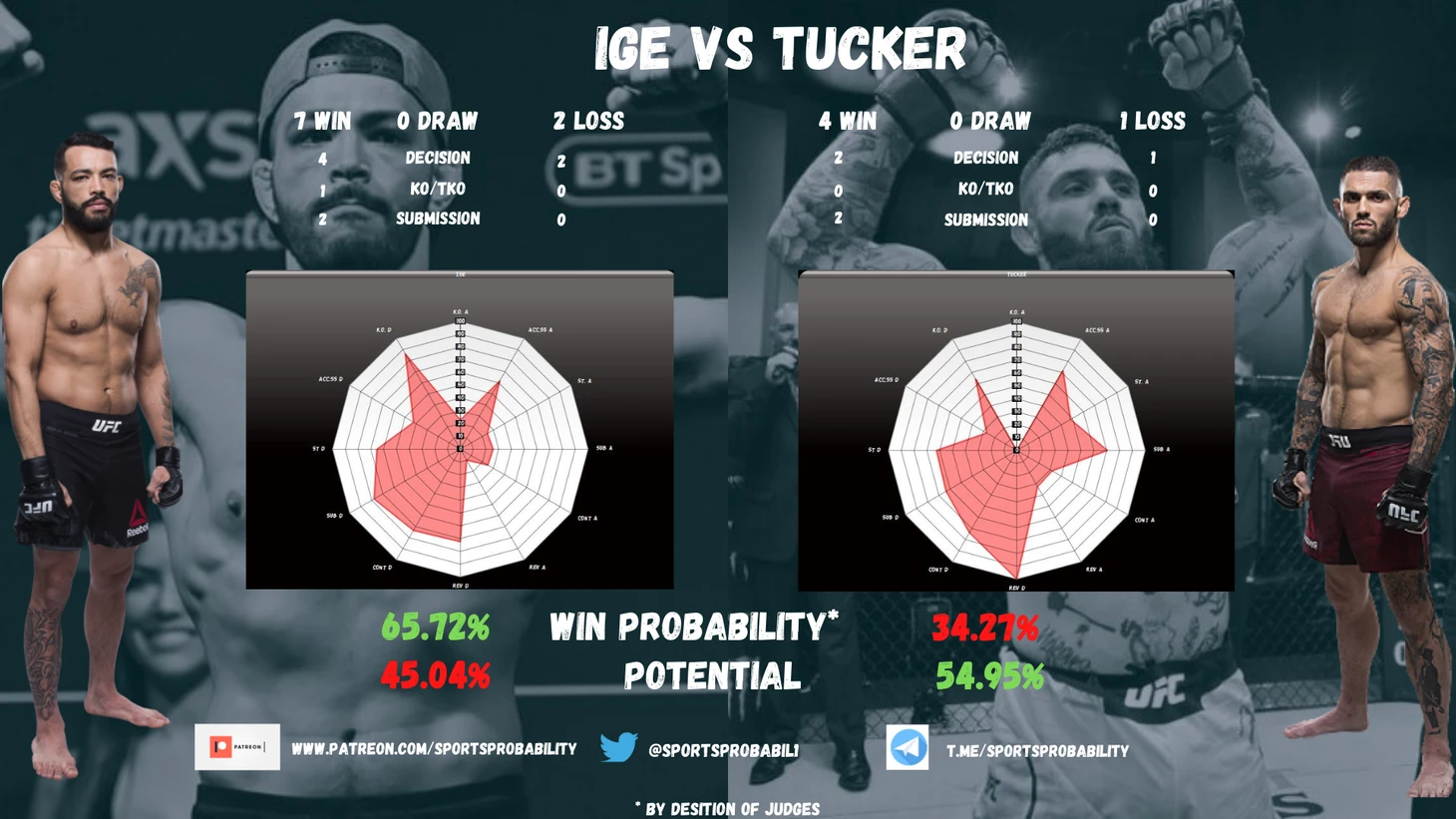 Ige vs Tucker. Не смотря на небольшое преимущество в средних показаелях, все же я отдам предпочтение Ige. Открою маленький секрет. Тема еще не до конца оформлена, но я смотрю на коэф. корреляции бойцов. И у Tuckera есть существенная связь между точными акцентированными ударами, и тем, как он набирает очки. А так как шансы на то, что Ige перебьет Tuckera в районе 70%, то и предпочтение я бы отдал Ige.