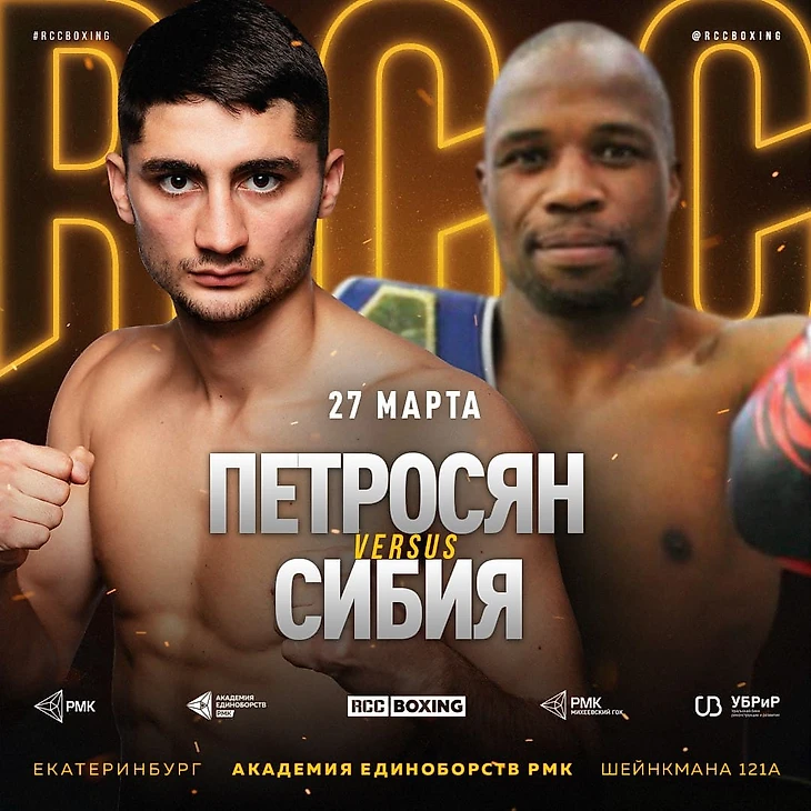 Украинский боксер Зоравор Петросян (10-0) и Коос Сибия (23-14-5) из Южной Африки проведут рейтинговый бой на турнире RCC Boxing Promotions, который пройдет 27 марта в Екатеринбурге на арене Академии единоборств РМК.