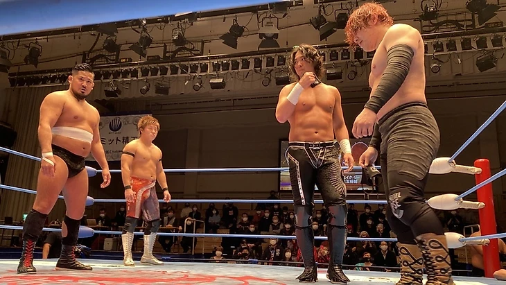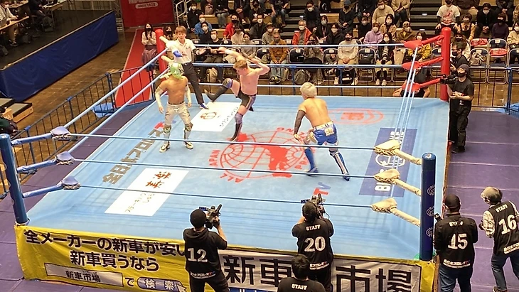 — Дальше был матч 3 на 3 между TOTAL ECLIPSE (Джейк Ли, Хокуто Омори и ТАДЖИРИ) против Шотаро Ашино, Коджи Ивамото и Хикару Сато. Матчу выделили приличный хронометраж, да и в целом действия были весьма активным и не без тех самых ноток личной драмы, особенно между Ивамото и Ли. Но в итоге 14-минутного побоища, Джейк Ли удержал Хикару Сато и принёс своей команде победу.
