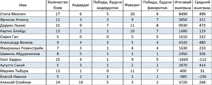 И на самое сладкое Алексей Олейник, это просто противоположность Тыбуре. Если Марчин почти всегда фаворит, то Олейник почти всегда андердог. У него самый высокий процент поединков во всем топ-15 тяжелого веса, в которых он является аутсайдером. В 10 из 14 поединков в него не верили букмекеры, еще в одном бою у него были равные коэффициенты с соперником. И к своей чести, являясь андердогом, Алексей побеждал в 50% случаев. Благодаря этому Олейник занимает 5 место среди бойцов из этого списка по суммарной прибыли, которую мог бы принести, если ставить на него в каждом поединке одну и ту же сумму.