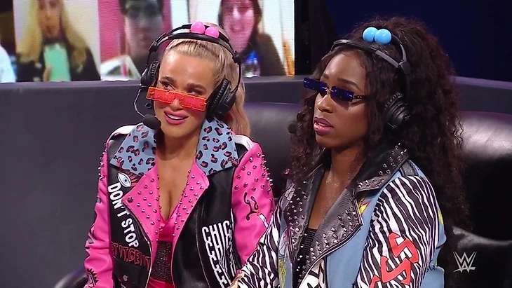 Лана и Наоми как бывшие претендентки на женские командные чемпионства WWE следили за матчем вместе с комментаторами.
