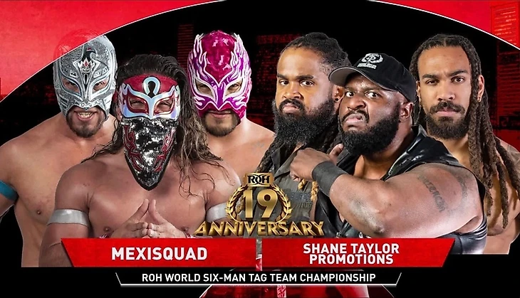 0-2) MexiSquad (Бандидо, Рэй Хорус и Фламита) против STP (Shane Taylor Promotions - Шейн Тейлор, Каун и Мозес) - титульный поединок за командные мировые трио-чемпионства ROH.