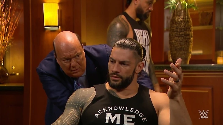 А сейчас "Вождь Племени" в сопровождении трёх друзей - Джея Усо, Пола Хеймана и своего титула - неспешно взошёл на ринг и собирался с мыслями под чанты "You Suck" (и под сладкоголосые речи от МакАфи). Спустя несколько секунд Хейман подал Роману микрофон, но тот не спешил начинать из-за чантов (дежавю 4-летней давности дали о себе знать). В итоге Рейнс своим вопросом о том, кого именно Рейнс побил в мэйн-ивенте 2-го дня главного шоу года - Пол тут же перечислил достижения Дэниела Брайана и Эджа как в профессиональной карьере, так и в личном отношении, что привело к определённым схожим моментам именно между поверженными и уже бывшими претендентами на титул самоанца.