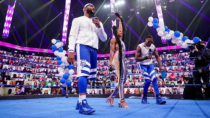 Перед началом этого боя Профиты и команда работников арены украсили ринг для празднования. Казалось бы чего именно, если они сами ничего не выигрывали неделю назад перед WrestelMania 37. Только вот тут был иной повод - это празднование победы Бьянки Белэйр над Сашей Бэнкс в мэйн-ивенте 1-го дня главного шоу года в матче за женское чемпионство синего бренда. Профиты разумеется не могли не сказать о том, что успех Бьянки дал им почву для вдохновения и они готовы к своему прорыву, но сейчас они передают слово именно ей. Она вышла на ринг для своей речи, рассуждая о том какой сложный путь она в итоге прошла, разумеется не в одиночку (упоминая семью и в частности своего мужа, коим и является Монтез Форд). При этом Белэйр даёт понять, что она готова быть тем самым примером для остальных - сейчас и навсегда, а также говорила упомянула Сашу Бэнкс. Причём она поблагодарила Сашу за то, что разделила с Бьянкой тот самый исторический момент в главном событии 1-го дня. Они обе сделали этот большой момент и теперь они часть истории, о которой будут говорить сквозь годы. Минутка милых обнимашек семейного пошива, а затем Бьянка дала понять что Монтез и Анджело должны сегодня сделать не менее ответственное дело - вернуть себе командные титулы бренда, любой ценой и показать что они заслуживают свой особый момент не меньше Бьянки. Профиты настроились и были готовы к бою.