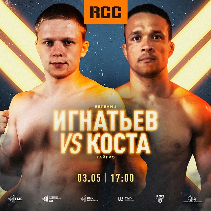 Российский боец Евгений Игнатьев (15-2-2) и бразилец Тайгро Коста (17-6) встретятся 3 мая на турнире RCC 9 в Екатеринбурге. Под сводами пятитысячной арены КРК «Уралец» их ждет трехраундовый бой в полулегком весе.