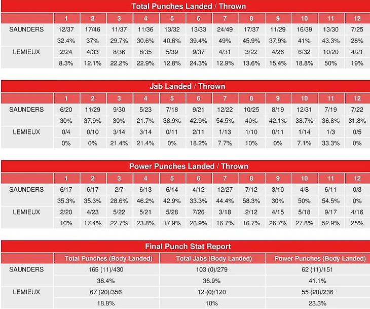 Для сравнения, Лемье не выглядел настолько безнадежным в бою с Головкиным, с которым он пытался рубиться. А что касается боя с Сондерсом, то там канадец зачастую сотрясал воздух своими безнадежными атаками. Сондерс перебоксировал канадца по всем статьям на его земле, попав в него джебом свыше 100 раз. Лемье достал Сондерса джебами всего лишь 12 раз, хотя выбросил в 10 раз больше. После этого эталонного перформанса в Канаде, отношение к Сондерсу изменилось в лучшую сторону. Некоторые эксперты усомнились в том, что Головкин сможет уложить этого неугомонного цыгана.