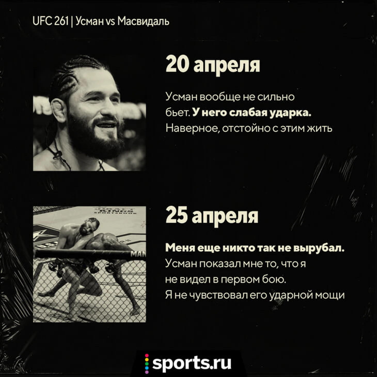 «Усман вообще не сильно бьет. У него слабая ударка, одна из самых слабых среди всех, с кем я дрался. Наверное, отстойно с этим жить», – перед боем Масвидаль всячески напоминал о том, что Усман не смог финишировать бойца, который вышел на коротком уведомлении.