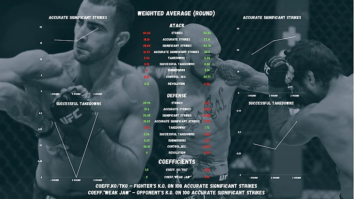 Средневзвешенные показатели бойцов за 1 раунд. Плюс динамика акцентированных ударов и тейкдаунов в 3-х раундных поединках. Классика. (Если плохо видно, откройте изображение в новой вкладке).