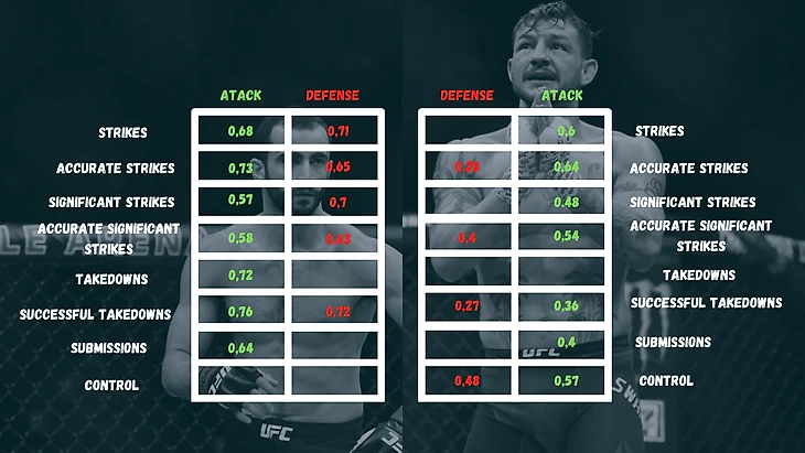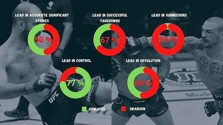 Как мы видим, у бойцов равные шансы на лидерство по акцентированным ударам, но у Свонсона выше вероятность лидерства по успешным тейкдаунам. Хоть и не большое, но все же лидерство.
