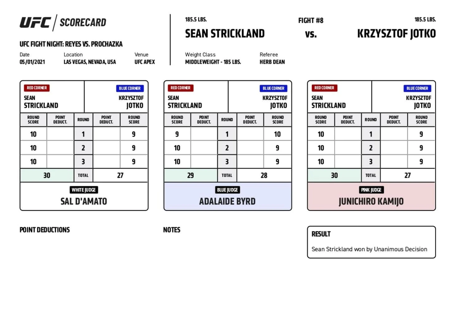 Sean Strickland def. Krzysztof Jotko via unanimous decision (30-27, 30-27, 29-28) Этот бой был под контролем Стрикланда на протяжении всех трёх раундов, но карточки показали, что один из трёх судей отдал какой-то из раундов поляку. Последующее изучение записок показало, что этим судей была небезызвестная Аделаида Бёрд и она каким-то образом умудрилась отдать Жотко первую пятиминутку, которая была самой разгромной для поляка.