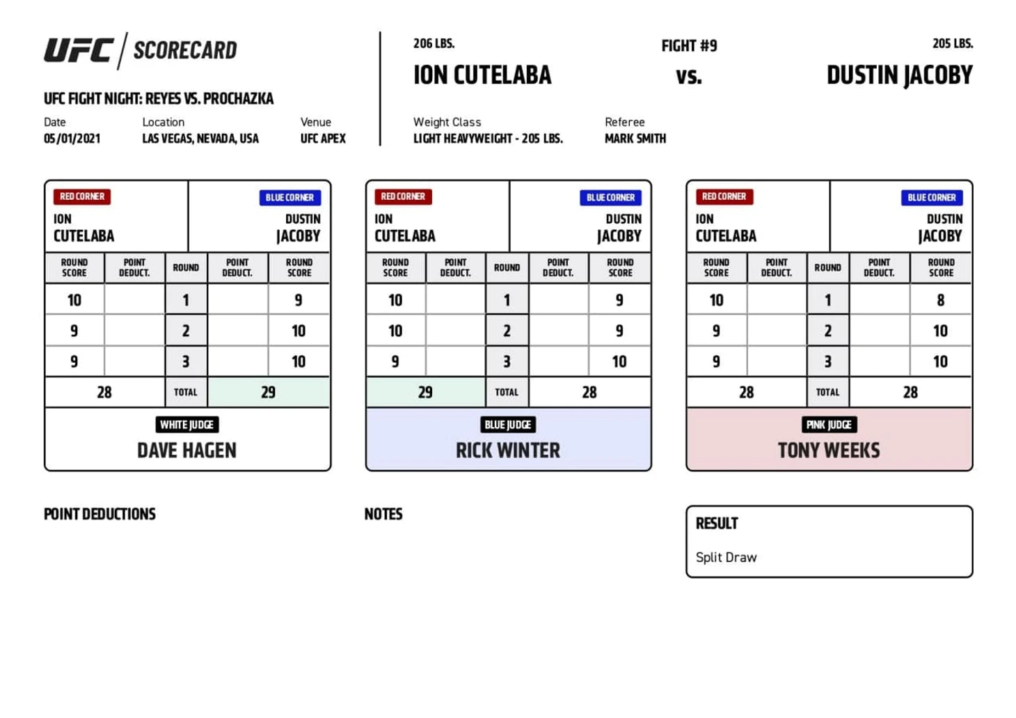 Ion Cutelaba vs. Dustin Jacoby declared split draw (29-28, 28-29, 28-28) Кутелаба был неплох в первом раунде и многие считают, что он забрал его со счётом 10 - 8, но в последующих пятиминутках дала знать о себе плохая выносливость и Джакоби в целом выглядел значительно лучше. В итоге получилась ничья, но не классическая, когда разгромный раунд 10 - 8 уравнивается двумя по 9 - 10, а раздельное решение. Так редко бывает, но у каждого из трёх судей был свой, отличный от остальных, вердикт.
