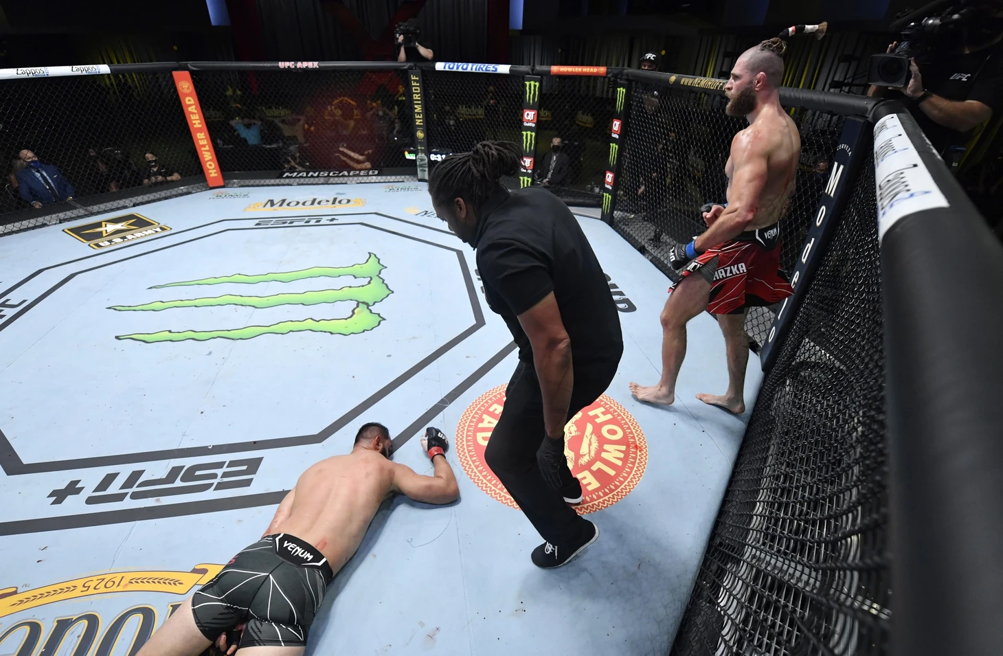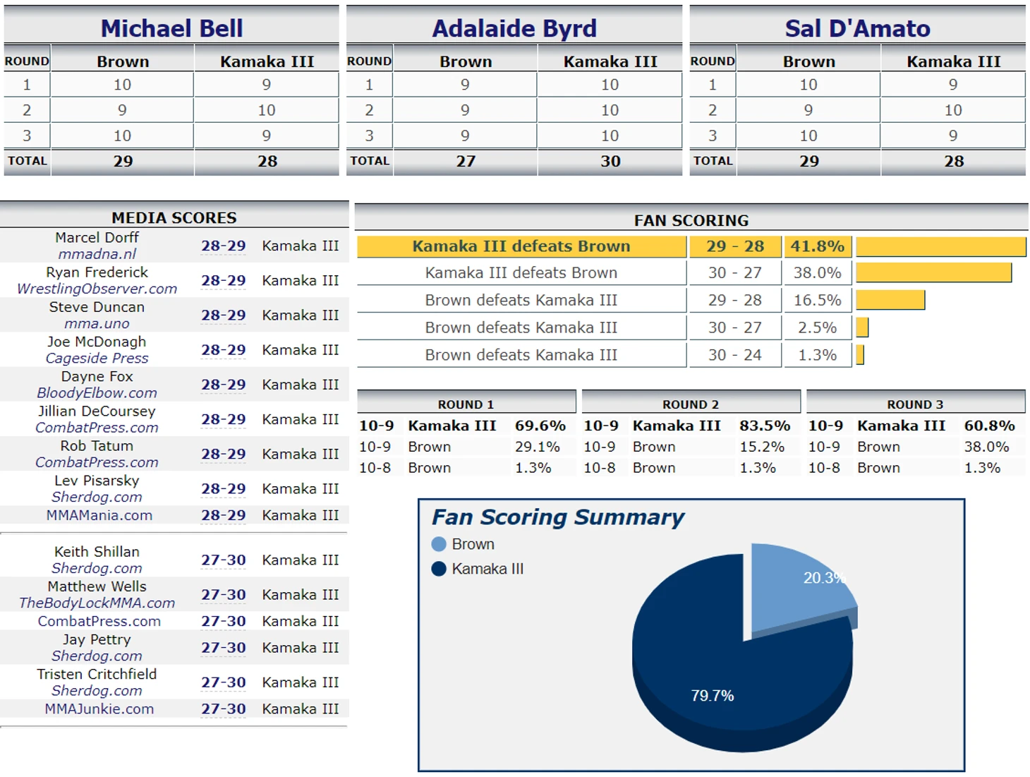 TJ Brown def. Kai Kamaka via split decision (27-30, 29-28, 29-28). Браун не победил в этом бою, по мнению подавляющего большинства зрителей, журналистов и экспертов, но даже этот судейский буллщит смог заработать за счёт двух грубейших нарушений. На последней минуте третьего раунда Камака контролировал его на земле и Браун дважды намеренно и схватился за сетку, чтобы подняться в стойку. Рефери это видел, дважды бил ему по руке и кричал, но нарушения произошли, Браун встал и смог нанести несколько жёстких попаданий, забрав тем самым третий раунд. Каким образом в 2021ом году, нарушая правила на глазах у всего мира, можно одержать победу? Ах да, я же забыл, что рефери в том бою был Джейсон Херцог.