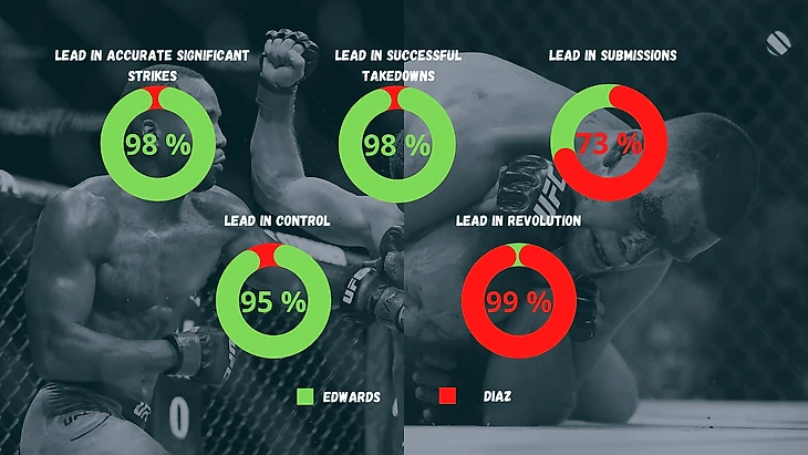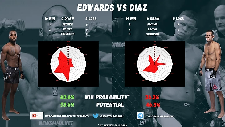 Начнем с того, что это будет довольно необычный поединок (по моей оценке). Почему? Потому что, если это будет 3-х раундный поединок, то шансы на победу выше у Диаса, а если 5-ти раундный поединок, то шансы на победу выше у Эдвардса. Почему так? Потому что, при расчете шансов я смотрю на абсолютные показатели предыдущих поединков у каждого бойца. Статистика у Диаса в 5-ти раундных боях не самая впечатляющая, но это вы и сами сейчас увидите.