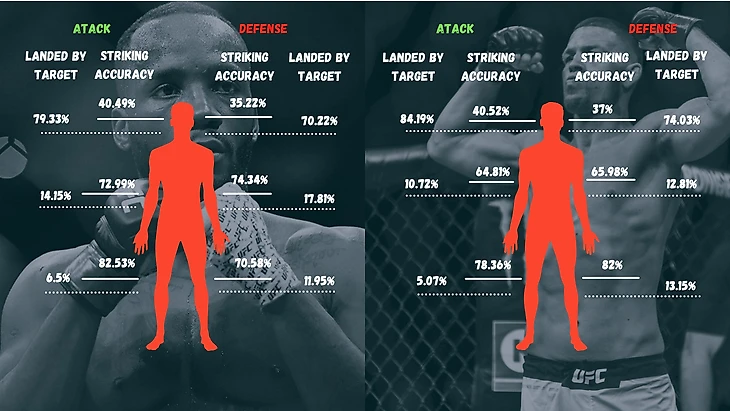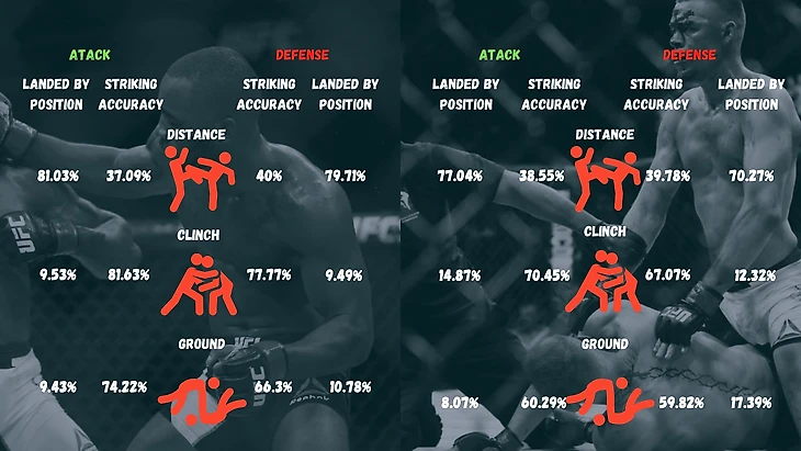 Из распределения ударов, по дистанции и "этажам" хотелось бы отметить довольно заметное распределение. То есть сами бойцы и их соперники не старались наносить удары на одной дистанции и одной части тела. Они пытались распределить урон. Не равномерно, но все же это более заметно, чем у других пар бойцов.