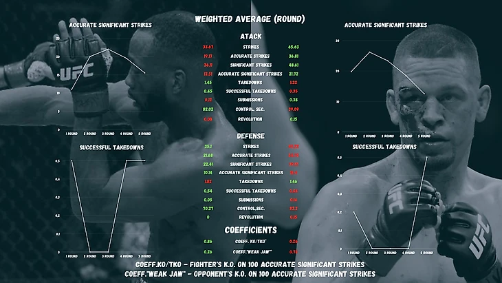 У Диаса же, почти полный комплект. Из-за столь большого количества боев, он и его соперники сделали статистическую связь, почти для каждого показателя, значимой.