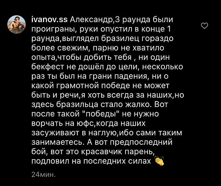• «Александр, 3 раунда были проиграны, руки опустил в конце первого, выглядел бразилец гораздо более свежим, парню не хватило опыта, чтобы добить тебя, несколько раз ты был на грани падения. Ни о какой грамотной победе не может быть и речи, я хоть всегда за наших, но здесь бразильца стало жалко».